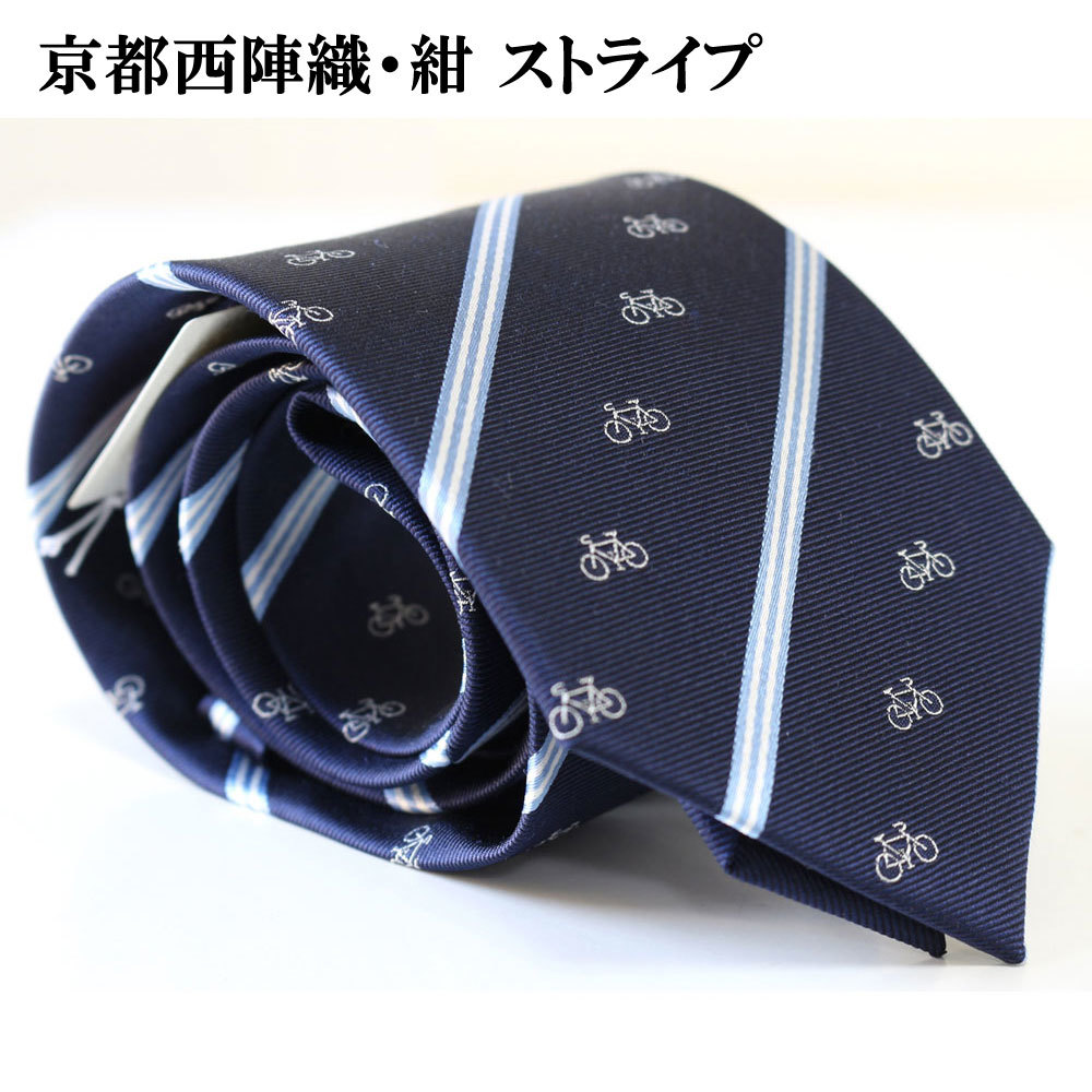 - 自転車ネクタイ 京都西陣織 自転車柄 ネクタイ シルク100% 日本製 紺 ストライプ