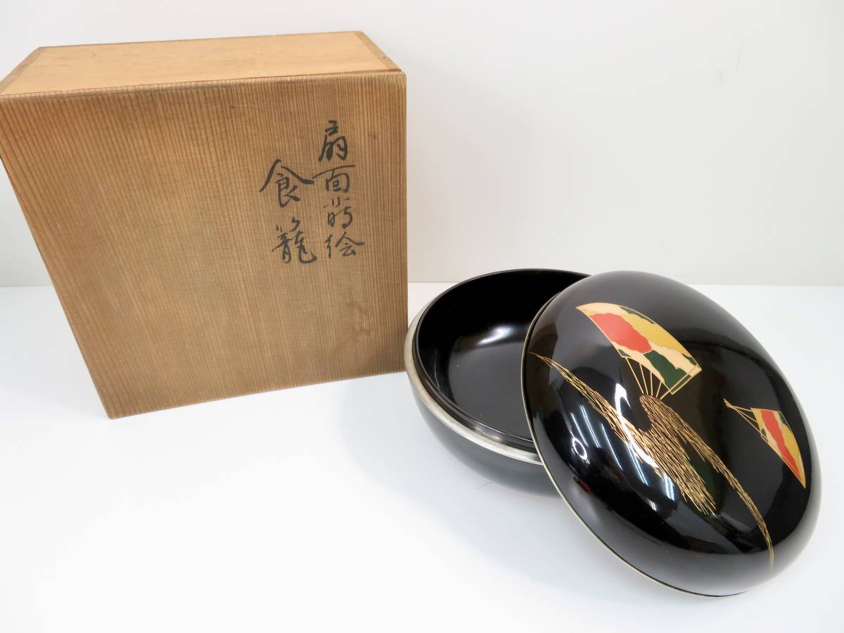 - ▲扇百蒔絵 食籠 蓋付 丸 黒 銀縁 木箱入 未使用品 管理2011 B-7