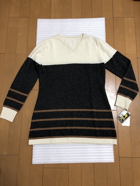 > 新品タグ付き、高級カシミヤ100%、丈長めのセーター★3万2780円→9980円即決★Mサイズ★カシミア100%★9号~グレー色×白色