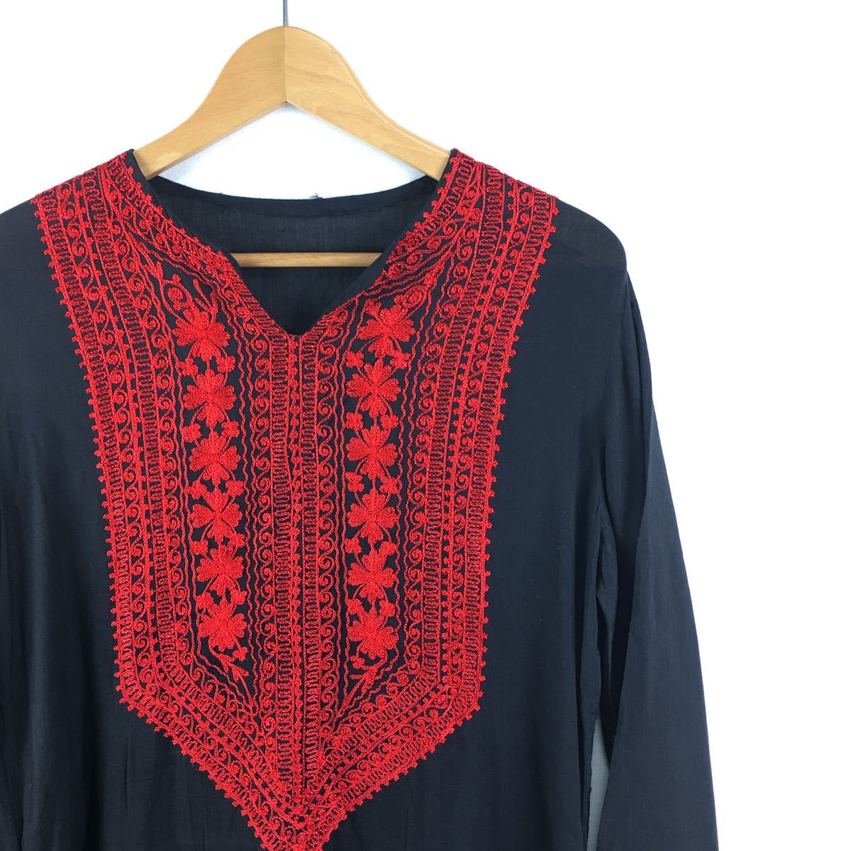 > ヴィンテージ 70s 刺繍【ブラック】クルタ ワンピース チロル ワンピ 古着 手刺繍 ハンドメイド 黒 アンティーク インド綿 民族 アフガン