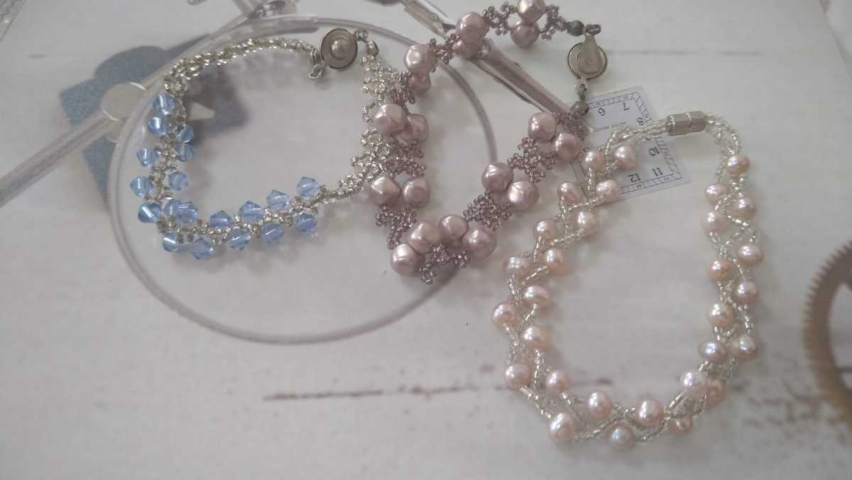 - □シルバーカラー&水色・スモーキーピンク・うすピンクビーズのブレスレット3個セット□