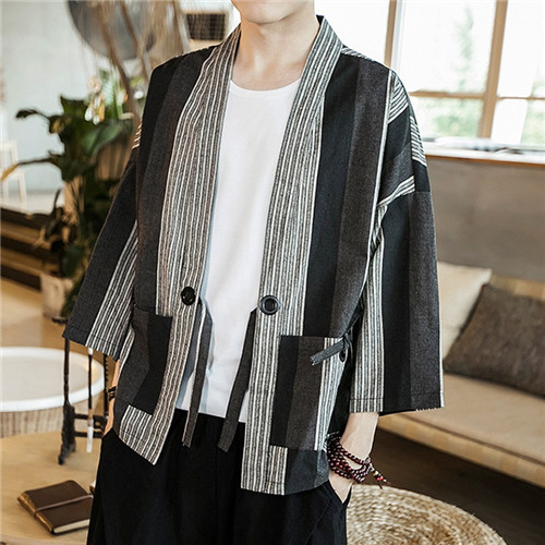 - メンズ シャツ カーディガン ジャケット パーカー 7分丈 和風 羽織 着物 浴衣 綿麻 ゆったり 部屋着 花火大会 ブラック XL/2XL/3XL/4XL/5XL