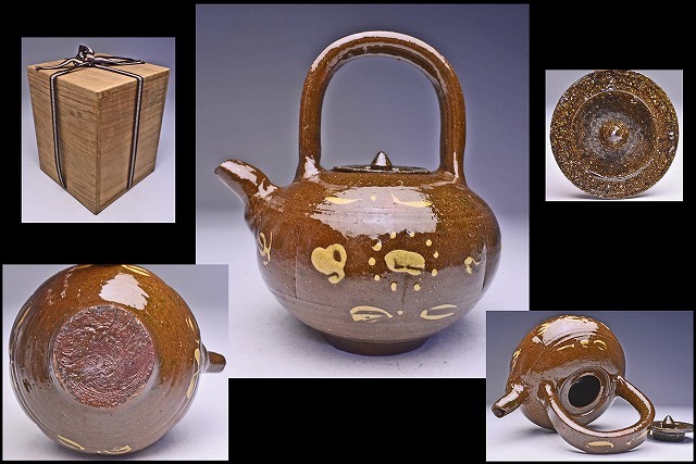 > 産地不明 ★ 土瓶 ★ 木箱 ★ 造形 釉調 良いが 注ぎ口が開いていないため花入や飾り物として ★ 雰囲気良好 ★ 民芸 ★ 飴釉?