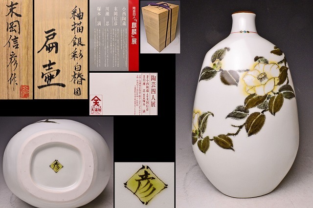 > 末岡信彦 ★ 釉描 銀彩 白椿図 扁壺 ★ 共箱 ★師: 人間国宝 藤本能道 ★ 繊細で見事な絵付の雅な逸品 ★ 華道具 ★ 希少