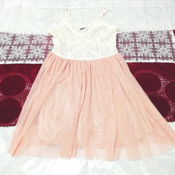 > 白ピンクレース綿コットン ネグリジェ ミニスカートキャミソールワンピース White pink lace cotton negligee miniskirt camisole dress