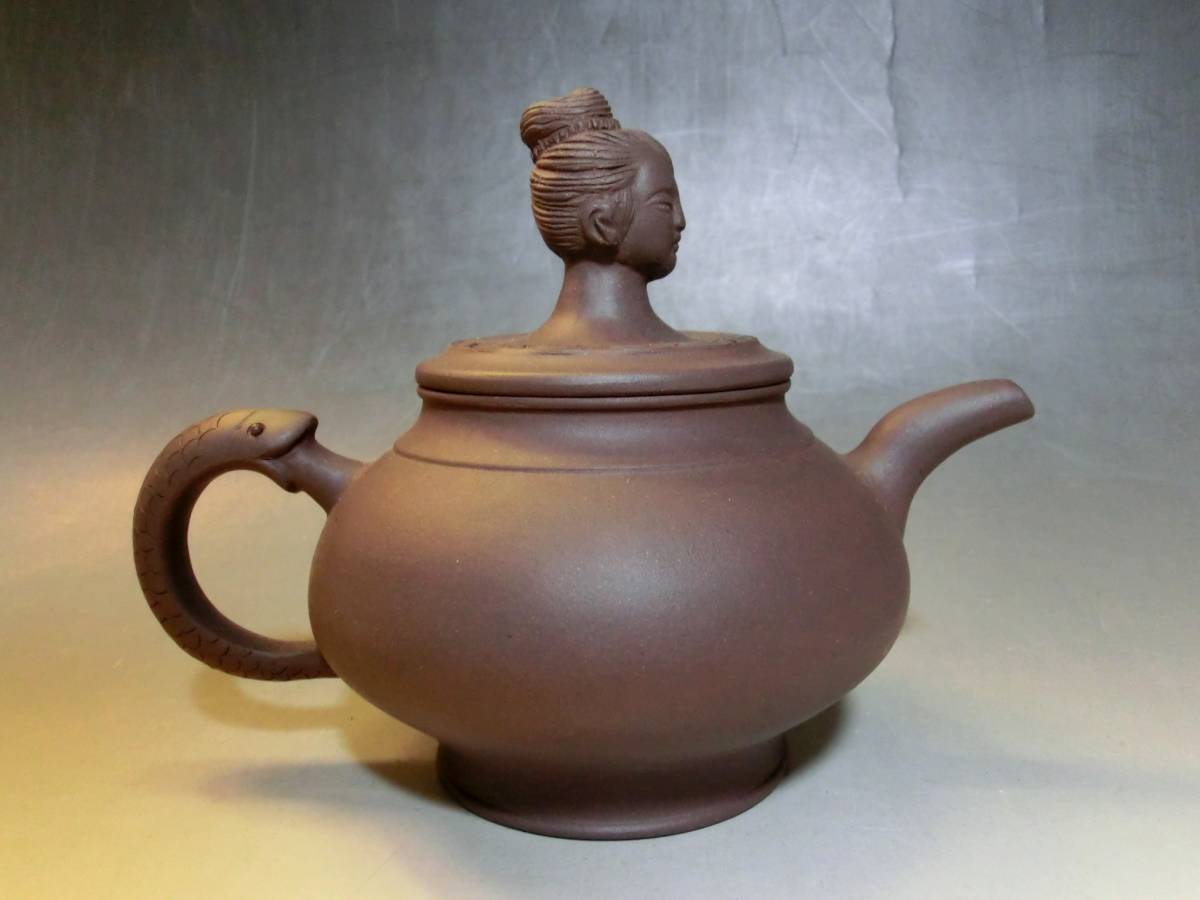 > 急須■紫泥 蛇後手頭摘み急須 朱泥 人物面つまみ 茶器 茶瓶 古玩 唐物 中国 古美術 時代物 骨董品 珍品希少■