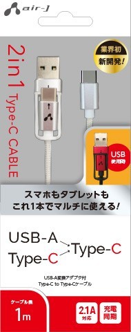 - ★2in1 USB-A変換アダプタ付 Type-C to Type-Cケーブル 1m・UKJ-TX100WH