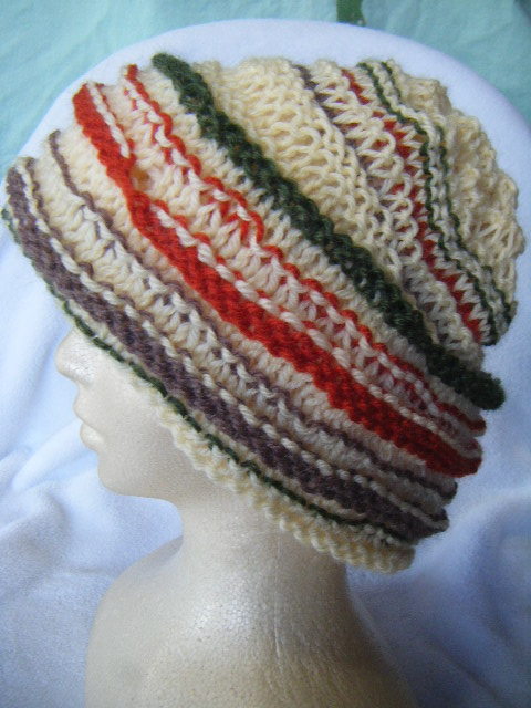 - 冬*折り返し用*手編み男女兼用*幅ゆったり/折り返しタップリ*クリーム色にアクセントライン え