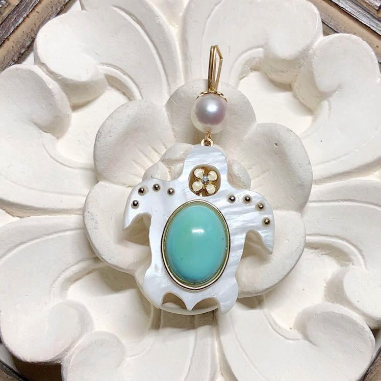 > ◆半額SALE!あこや真珠&天然 グリーンターコイズ ★シェル オリジナル ペンダントトップ♪ハワイアンジュエリー 29800
