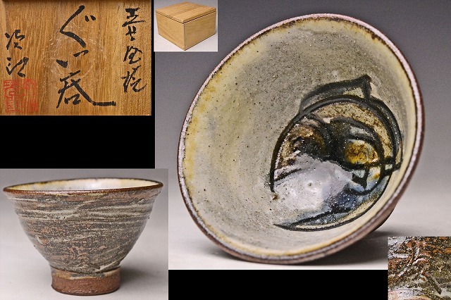 - 金城次郎 ★ 魚紋 ぐい呑 ★ 共箱 ★ 人間国宝 ★ 壺屋三人男: 新垣栄三郎 / 小橋川仁王 ★ 縁 : 浜田庄司