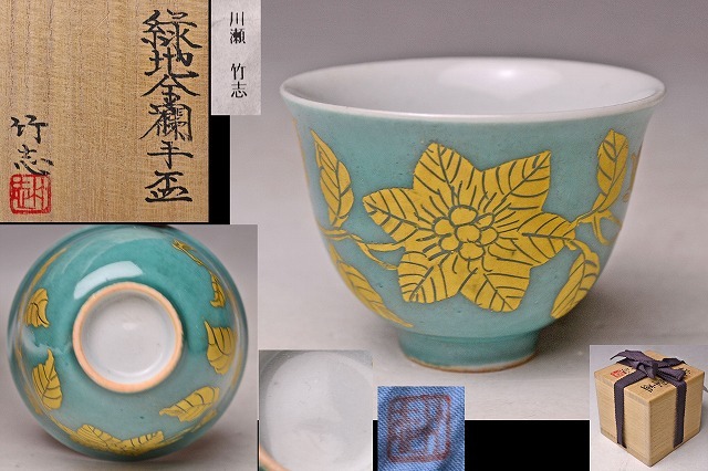 > 川瀬竹志 ★ 緑地金襴手ぐい呑 ★ 共箱共布栞 ★ 希少 ★ 物故作家 ★ 川瀬竹翁 川瀬竹春 川瀬順一 川瀬忍 川瀬満之 ゆかり