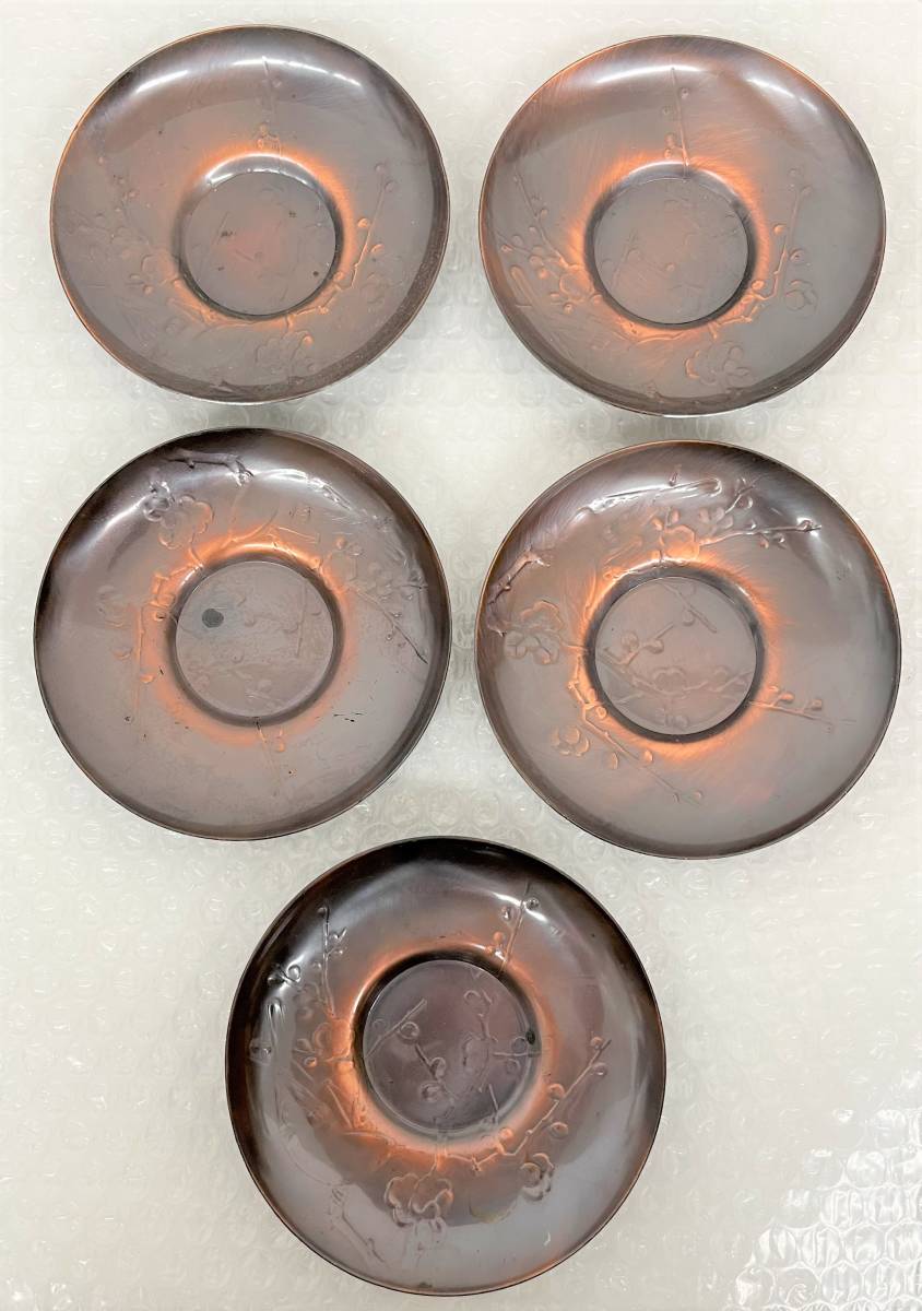 - 伝統工芸 工芸品 金属工芸 工芸美術 在銘なし 鶯 うぐいす 梅 うめ 文 茶托 托子 5客 5点 揃 丸型 茶器 茶道具 茶道 煎茶 日本 110×19mm
