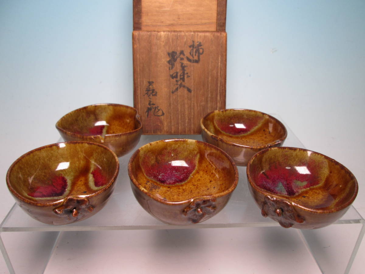 - ☆料理屋さんの器・在銘『柿』珍味入れ 五客 1傷 共箱 柿釉 豆皿