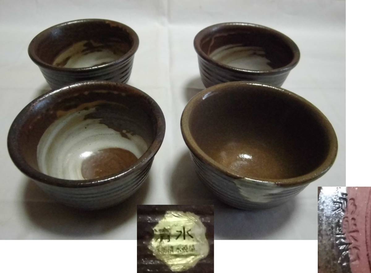 - 小さめ 味わいある 湯呑み茶碗 清水焼 永楽 4客 練り込み 茶器 盃 ぐいみにも 酒器 陶器 工芸品 レトロ
