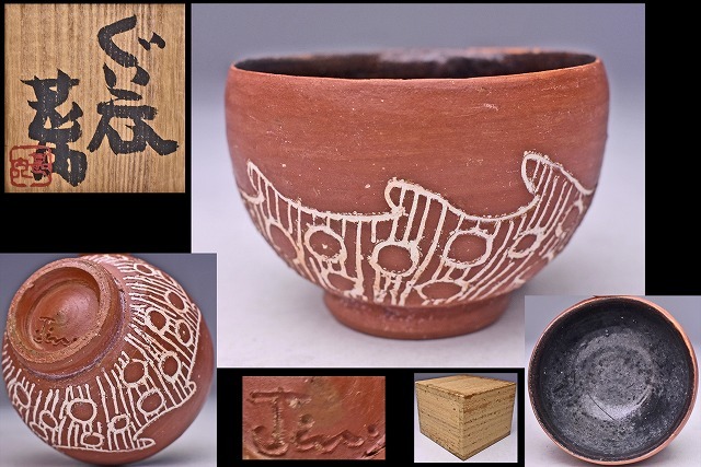 > 坂田甚内 ★ ぐい呑 ★ 共箱 ★ 彫紋 内天目釉 盃 ★ 師:加守田章二 ★ 氏独特の意匠に肌の赤と見込みの黒のコントラストが美しい逸品
