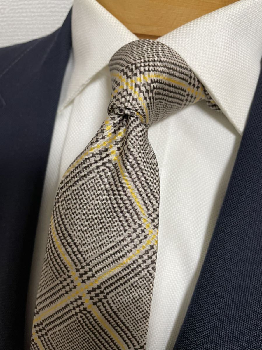 - 【美品】スーツセレクト プリントネクタイ チェック柄千鳥 大剣約8cm ブラウン×ホワイト×イエロー 高級シルク ネクタイ