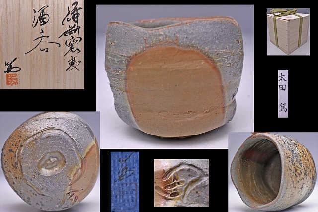 > 太田篤 ★ 備前窯変ぐい呑 ★ 共箱共布栞 ★ 景色良好 ★ グレーの窯変と 備前の土色のコントラスト