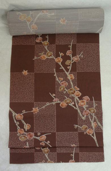 - 2909 洗える着物 原反 *東レシルック*「茶・市松梅」【わけあり】-