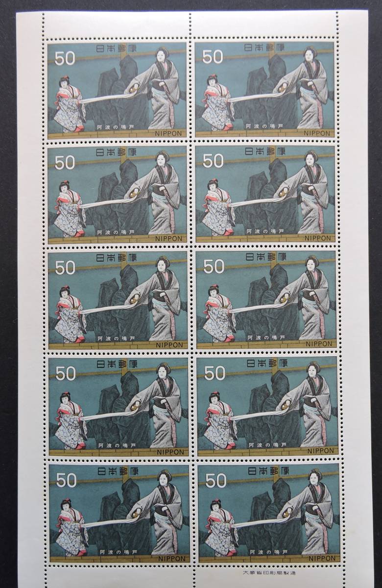 > 日本切手ー未使用1972年古典芸能シリーズ-3集(文楽)50円*10枚 全面シート 1シート