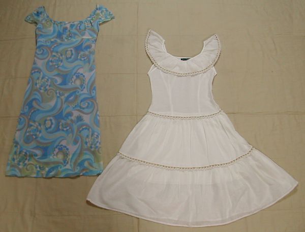 - ■美品:薄手ワンピース2点 カラフル青系&白に金ライン M位 DmL39