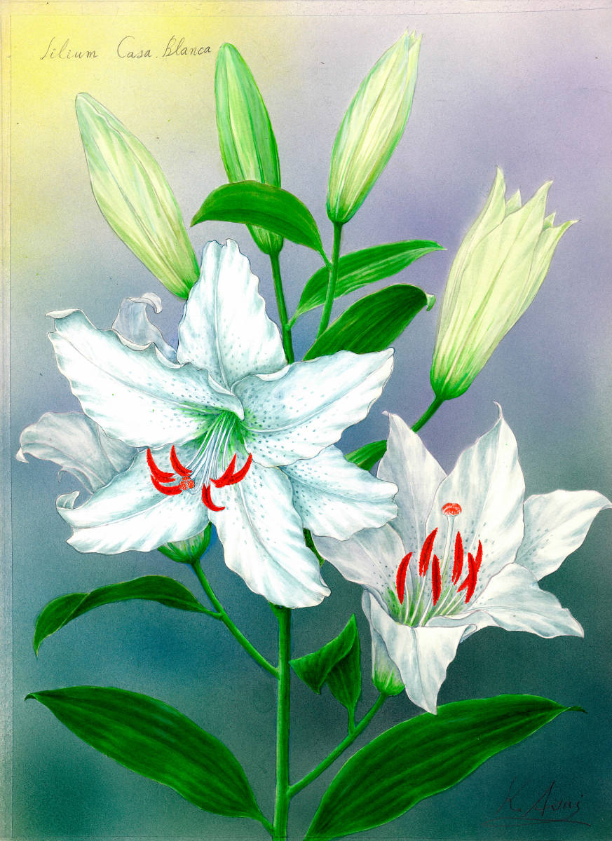- 水彩画 植物細密画「カサブランカー高貴」 真作