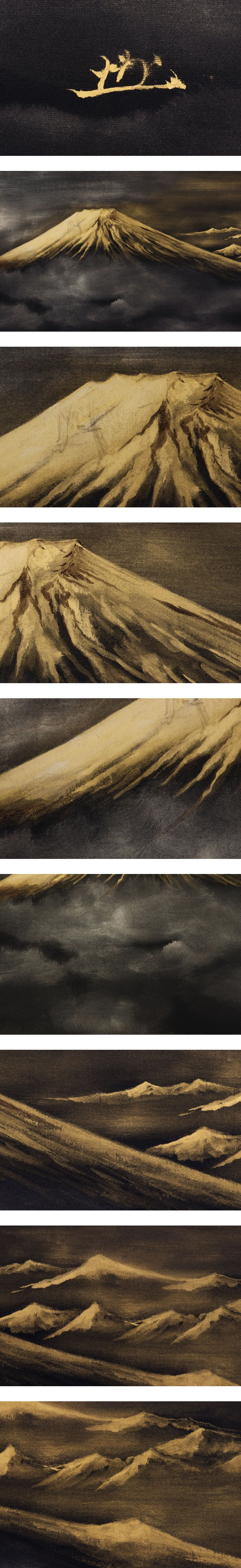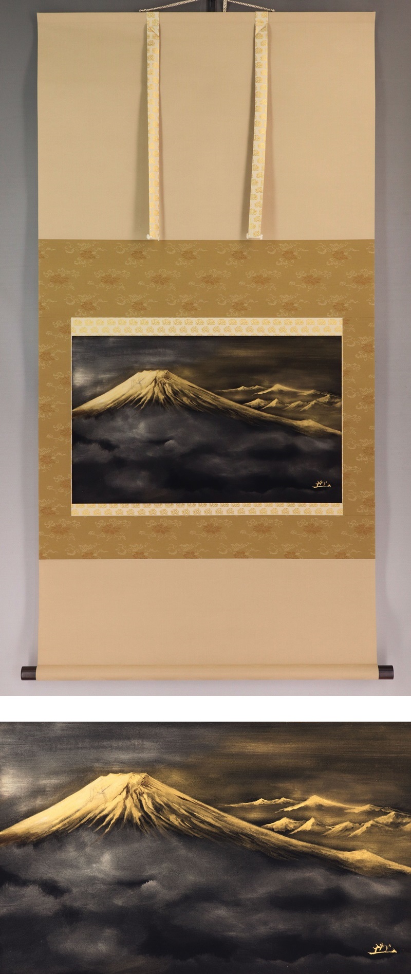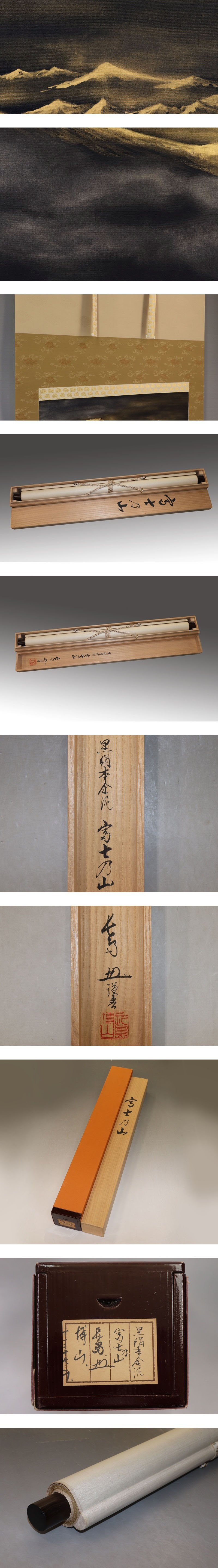 - 美品【真作】長島博山【富士乃山】◆黒絹本金泥◆共箱◆二重箱◆掛軸 v12200