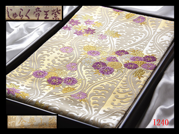 - I240厳選西陣 名門じゅらく帝王紫 振袖可 金華山織 華立涌紋 六通正絹純金糸高級美術袋帯 新品同様◇検簪着物名古屋帯帯締め