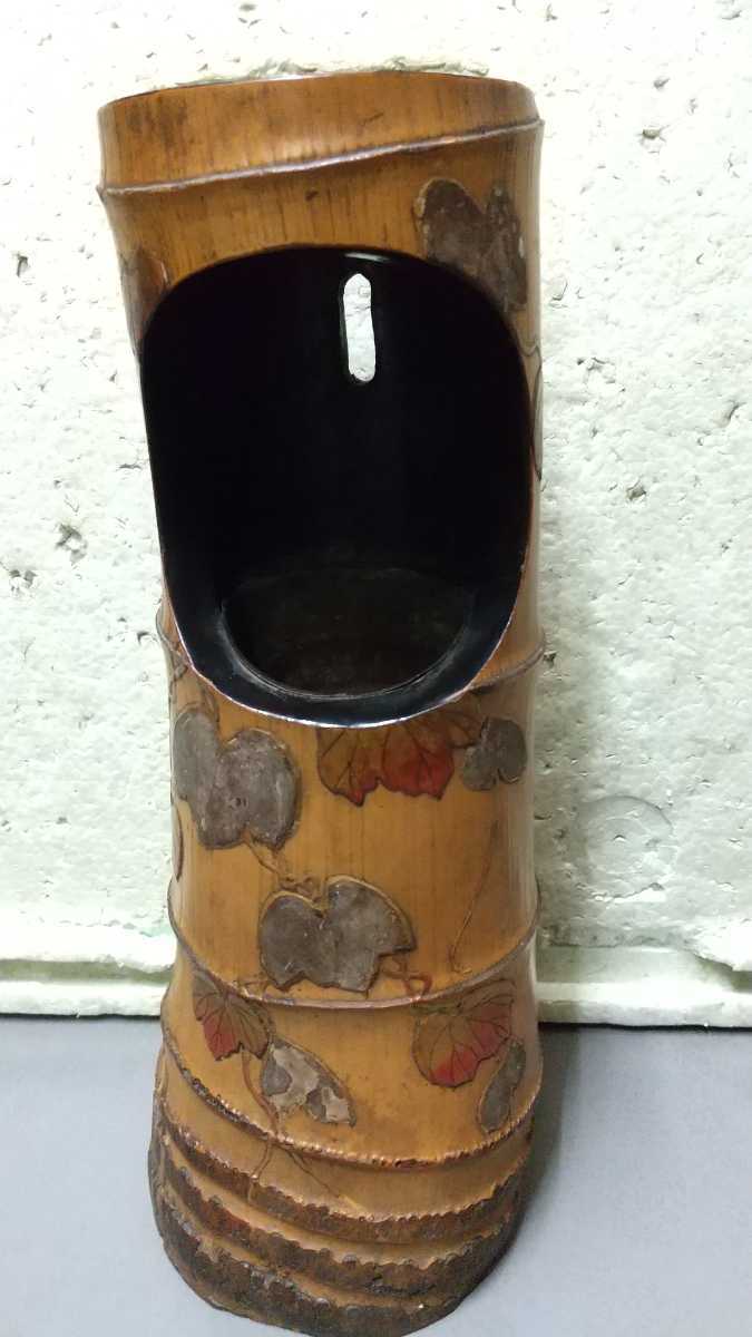 - 昭和レトロ アンティーク 孟宗竹 花瓶 花器 根竹 銅おとし 塗り物 漆塗り 古い 高さ28cm お茶道具