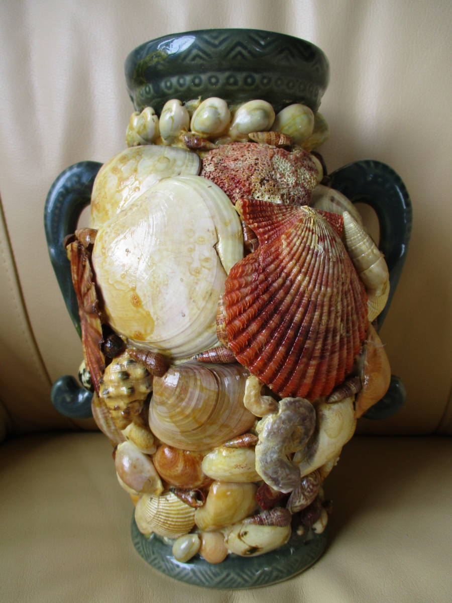 - ■花瓶★置物 オブジェ 持ち手 耳付 ★シェル 貝 貝殻 いっぱい! 巻貝・二枚貝 帆立 ヘビガイ サンゴ? など。。。グリーン系+貝殻 接着