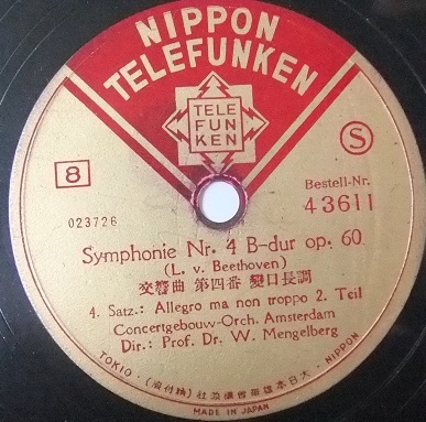 ベートーベン BEETHOVEN 交響曲「第4番」 SYMPHONY no.4 in B flat major より【第4楽章(其の1&2)】【4.Satz:Allegro ma non troppo (part1&2)】指揮:ウィレム・メンゲルベルク cond. Willem Mengelberg アムステルダム・コンセルトヘボウ管弦楽団 Concertgebouw-Orchestra Amsterdam 盤は程度の大きなヒビがございます。そのほか全体的にスレや汚れがございます。ノイズや針飛びがおこる可能性がございます。 レーベルに汚れや傷(汚れでPart1の面のレーベルカラーが色落ちしている状態です)がございます。盤のみ。 発売元 NIPPON TELEFUNKEN ノークレームノーリターンでお願い致します。上記の事をご理解・ご納得の上で入札をお願い致します。