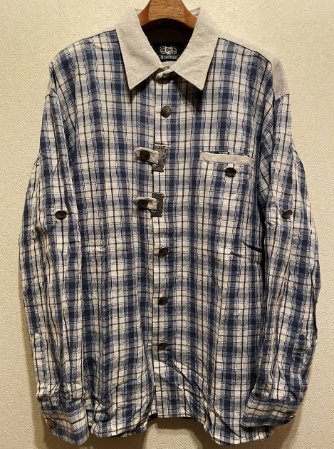 - コンチョボタン90sオールド希少デザイン切替シャツXLビッグシルエットXXLチロリアン美品リネン生成り麻コットン紺チェック90年代ビンテージ