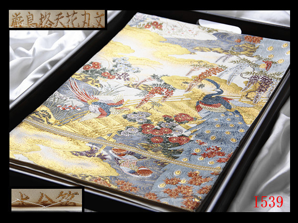 - I539厳選西陣 本金箔 振袖可 厳鳥格天花丸文 ベージュ色地 六通正絹純金糸高級美術袋帯 ◇検簪着物名古屋帯帯締め