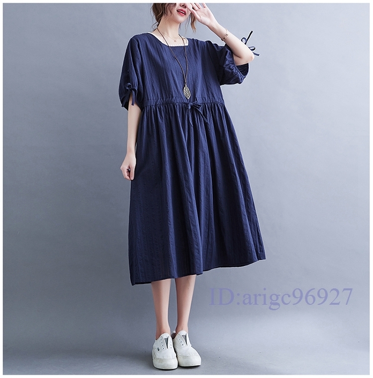 > M920★新品春夏**レディース*カジュアル*ゆったり大きいサイズ*綿麻*ウエスト調節半袖ロングワンピース*M~XXLネイビー