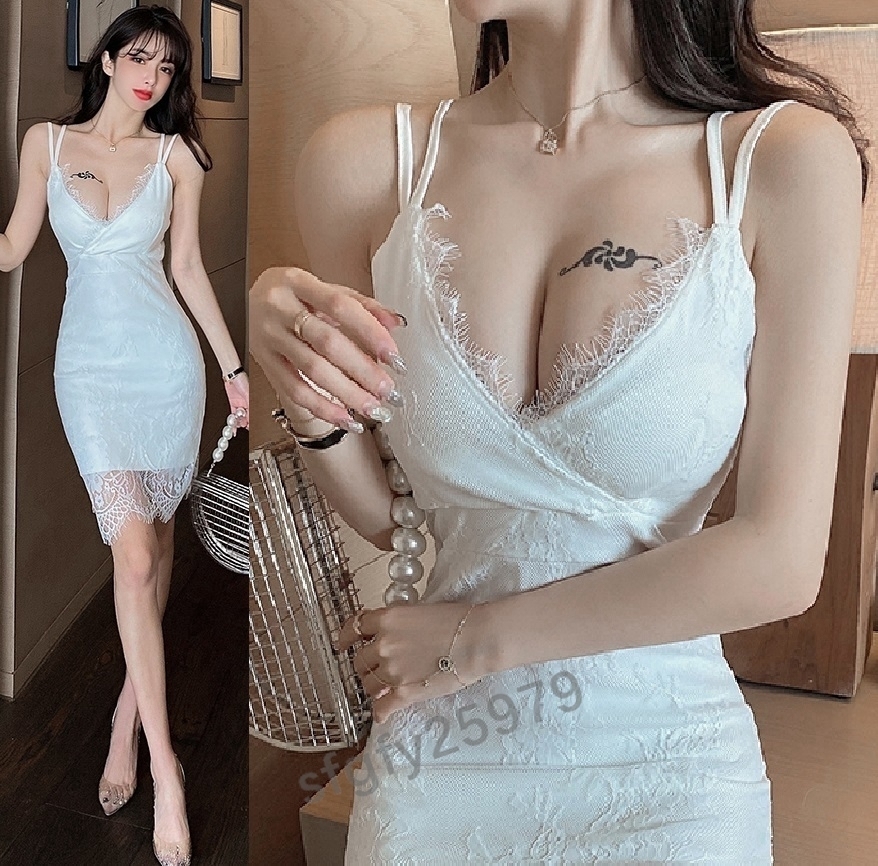 - E178☆セクシー*エロかわ?ぴったりボディライン?Vネック*カシュクール*花柄*総レース*キャミソール*タイトワンピース*白*伸縮性有り 2