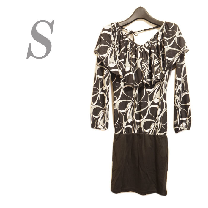 - ●新品/チュニック/ワンピース/黒系/モダン柄/S/フリル衿/レディース●f1259