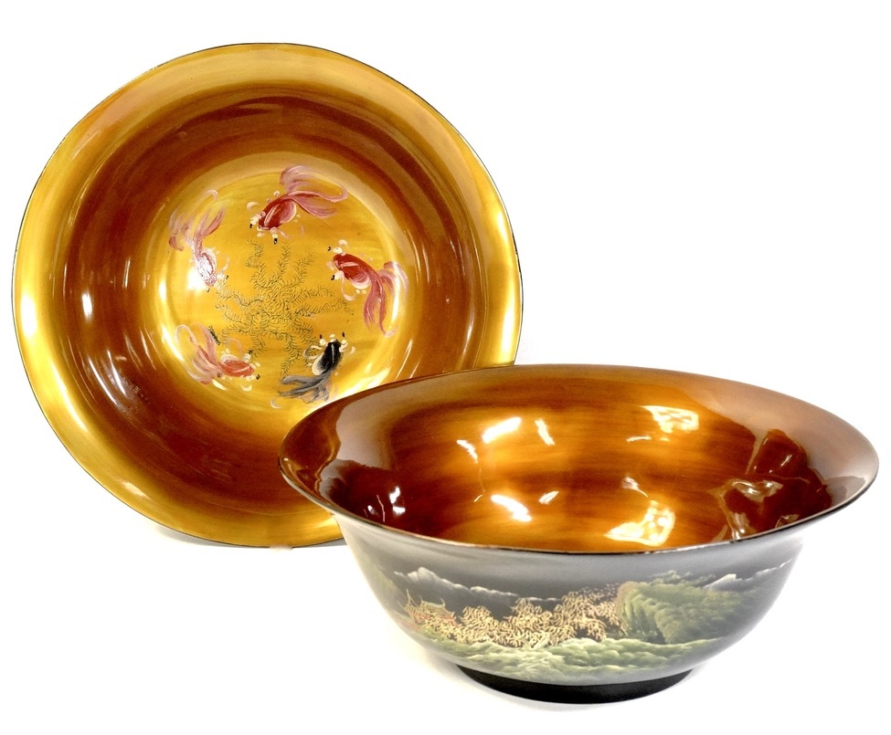 - 中国古玩 中国古美術 蒔絵楼閣山水内金魚遊泳図漆鉢 2点揃え 合成漆器 直径23㎝ 高さ8.5㎝ 細密な手描きの絵図が素晴らしい逸品! TKM