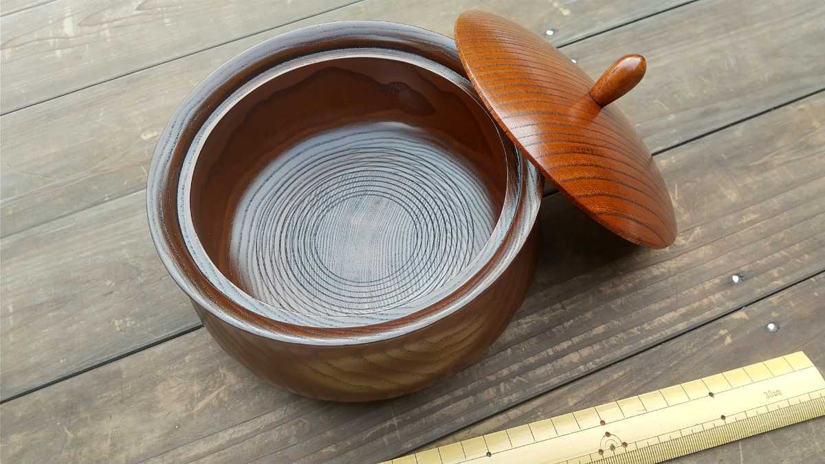 - 欅くり貫き菓子器 蓋物 クラフト宮本 平成の作 紙箱 未使用品 木製 菓子鉢