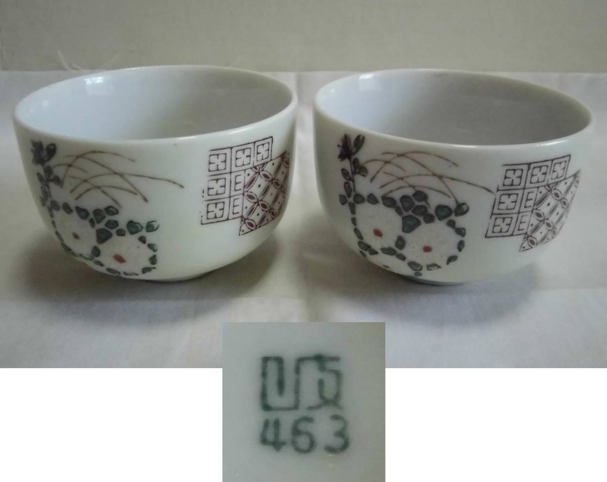 > かなり古い 湯呑み茶碗 岐463 2客 白菊 花柄 色絵 陶器 茶器 工芸品 レトロ アンティーク