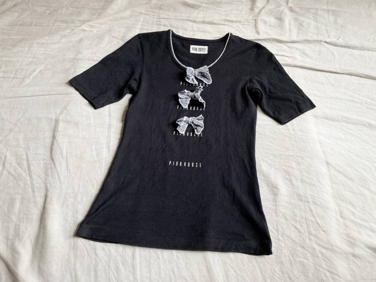 - 97年製 PINK HOUSE ピンクハウス リボン装飾 ロゴ プリント クルーネック カットソー Tシャツ M 黒 ブラック レディース ◇8
