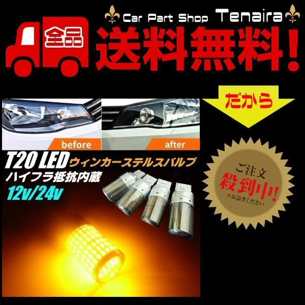 > 12V 24V ハイフラ防止 抵抗内蔵 LED 144連 T20 ピンチ部違い ステルス ウィンカー バルブ 4個 セット オレンジ アンバー 送料無料/5