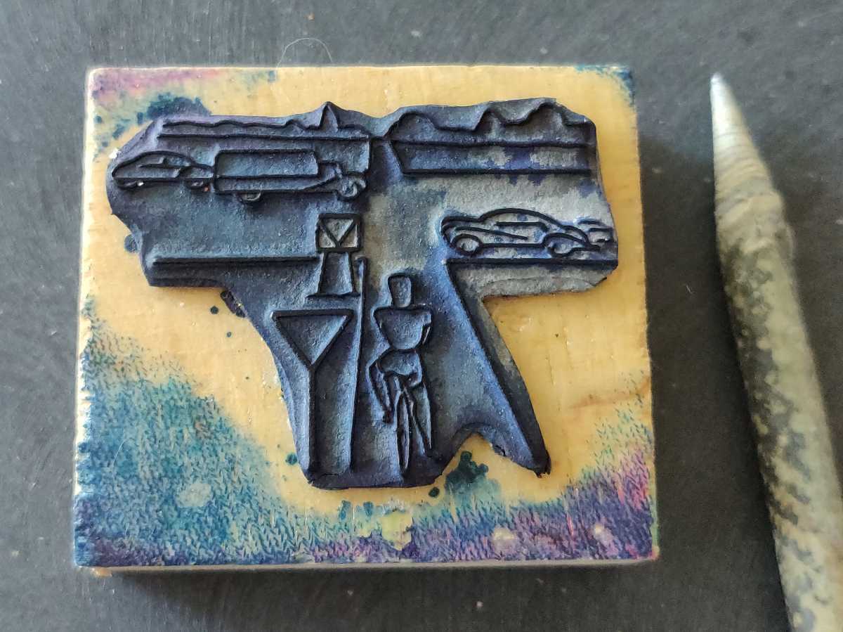 - 自転車 車 トラック 交差点 優先道路 一時停止 交通標識 止まれ 逆三角形 フランス アンティーク スタンプ ヴィンテージ 素材