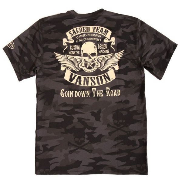 > VANSON ドライ 半袖Tシャツ スカルウィング 吸汗速乾 抗菌防臭 UVカット カモフラ【XL】 当店別注 バンソン ACV-903 迷彩 総柄 男女兼用 LL
