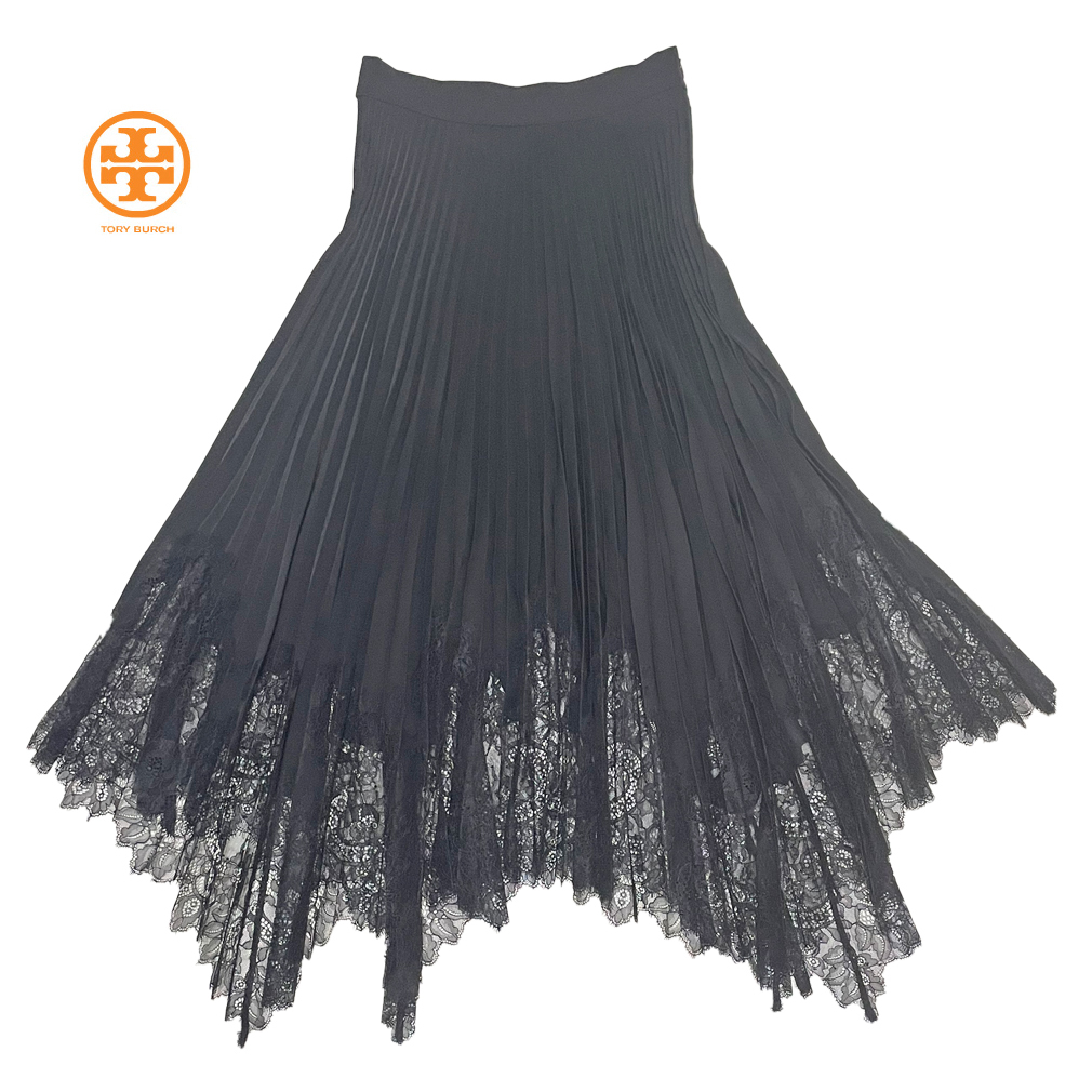 > 新品トリーバーチTORY BURCHプリーツロングスカート(Lace-Trim Sunburst Pleated Skirt)黒#XS★