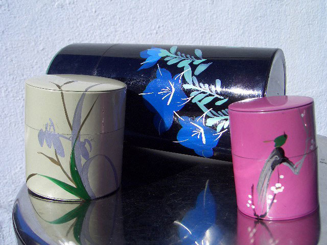> ※ 昭和レトロ 美しき ブリキ 茶筒 手書き 水仙 草花 野草 梅 鶯 和柄 モダニズム 古風 美人三姉妹 古民具 高度成長時代 平和な産業時代♪
