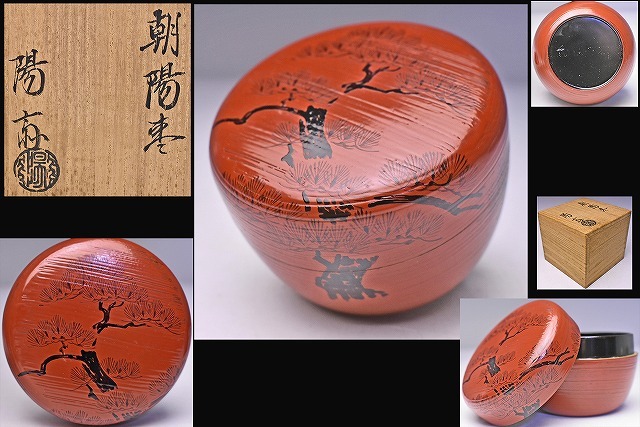 - 岡本陽斎 ★ 朝陽 棗 ★ 共箱 ★ 朱漆 漆器 茶道具 ★ 淡々斎好写