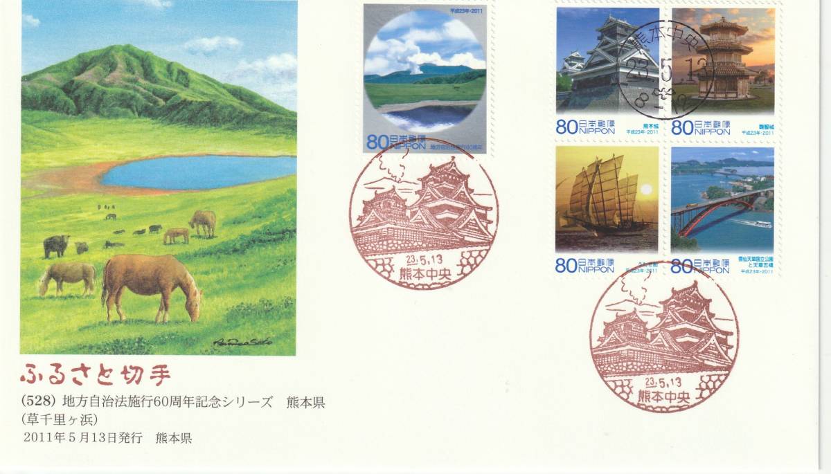 - FDC 2011年 ふるさと切手 地方自治法施行60周年記念 熊本県 80円 絵佐藤顕彦