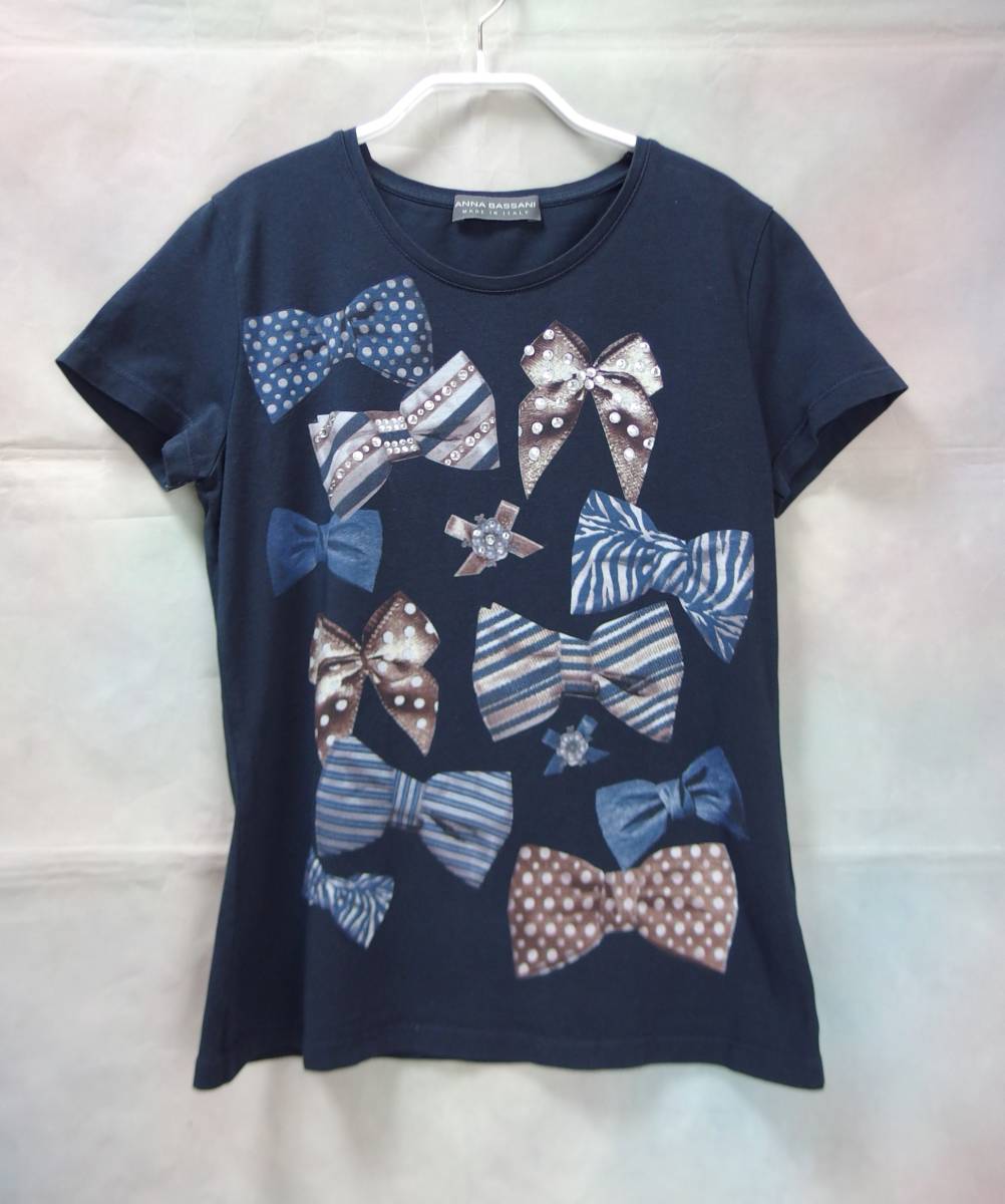 - アンナバッサーニ ANNA BASSANI ★ リボン柄 半袖Tシャツ 紺 Mサイズ