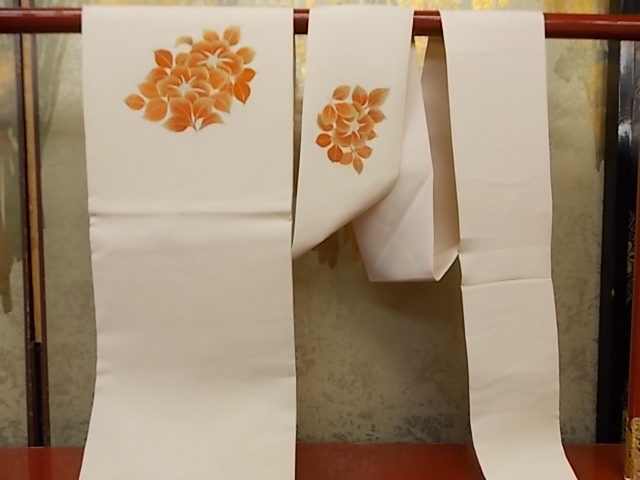 > きもの今昔4566 名古屋帯 塩瀬染帯九寸名古屋 アイボリー地 朱色に金振り椿手描き柄