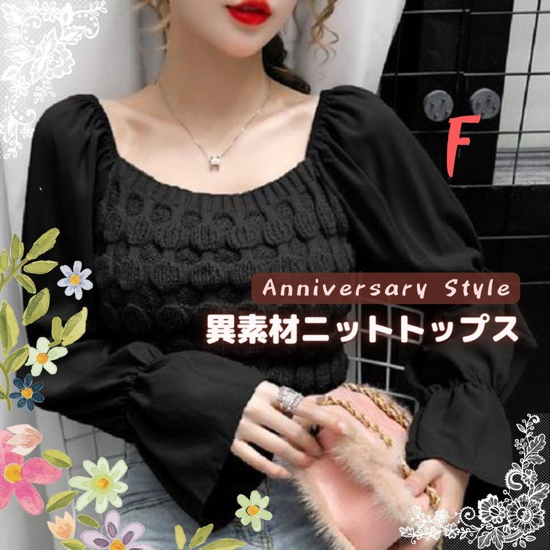 > トップス 黒 即納 ニット 切替 シャーリング 異素材 318596 大人可愛い 長袖 無地 デコルテ ショート丈 ボートネック オフショルダー