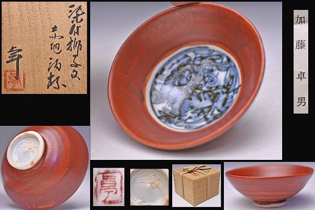 > 加藤卓男 ★ 染付 獅子文 赤地 ぐい呑 ★ 共箱 共布 栞 ★ 人間国宝 ★ 6代 加藤幸兵衛 ★ 赤地に染付が美しく細かな絵付が見事な酒器